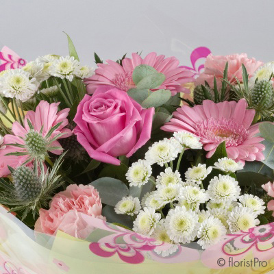 A truly sensational handtied bouquet of pink and white flowers including roses, gerberas and chrysanthemums, designed in an aqua style handtied for freshness, delivered in a beautiful gift bag.