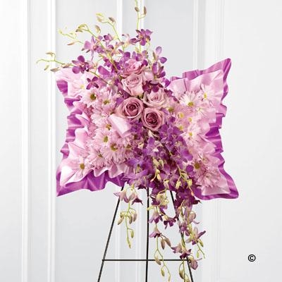 Light pink spray chrysanthemums, purple dendrobium orchids and lavender roses are beautifully arranged against a bed of purple and lavender satin to create a stunning presentation. Displayed on a wire easel, this arrangement bursts with grace and elegance.