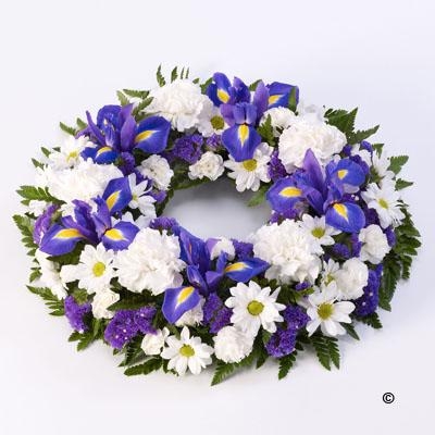 A classic selection of flowers including irises, carnations and spray chrysanthemums in blues and whites are nestled into this traditional circular wreath.