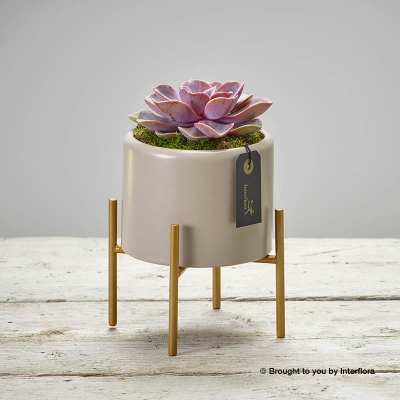 Our florists carefully pot a pink/pearl Echeveria plant  in a trendy grey ceramic pot, with a matte gold stand. Chic Pink is the perfect option to send as a lasting celebration of friendship, new home present or simply to say thinking of you.