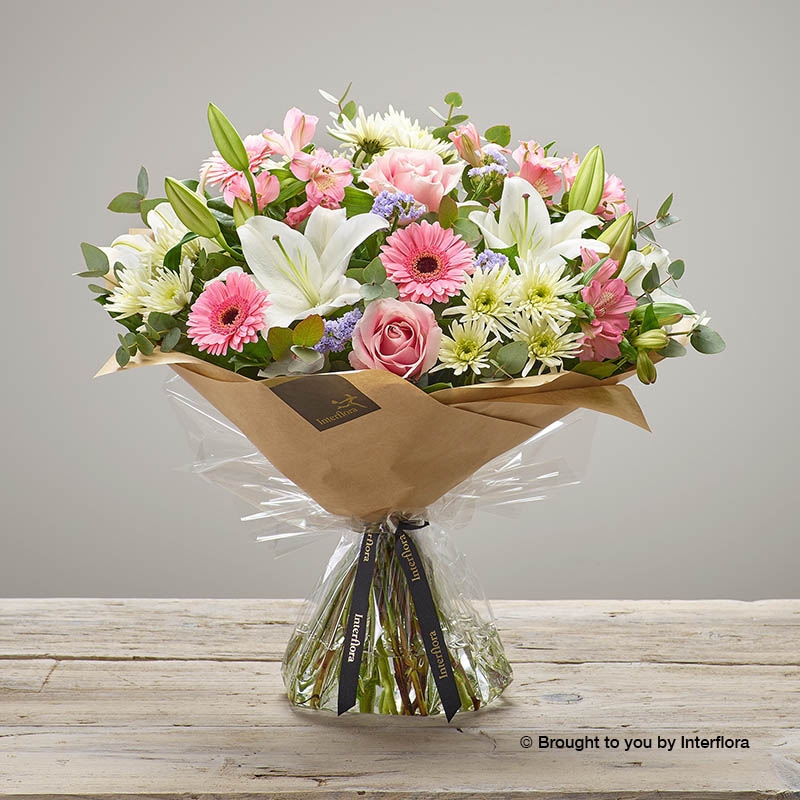 Our flower team use some of the most popular blooms including white lilies, chrysanthemum, pale pink roses, alstroemeria, pink germini and lilac statice. We add salal tips and eucalyptus for texture and greenery to compliment the flowers.