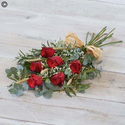 Gorgeous roses and eucalyptus beautifully combined with natural elements including dried wheat and a raffia bow.